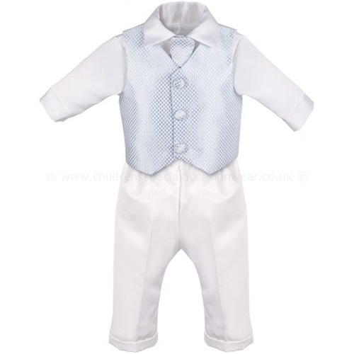 Check pale blue waistcoat and cravat, white shirt and trousers