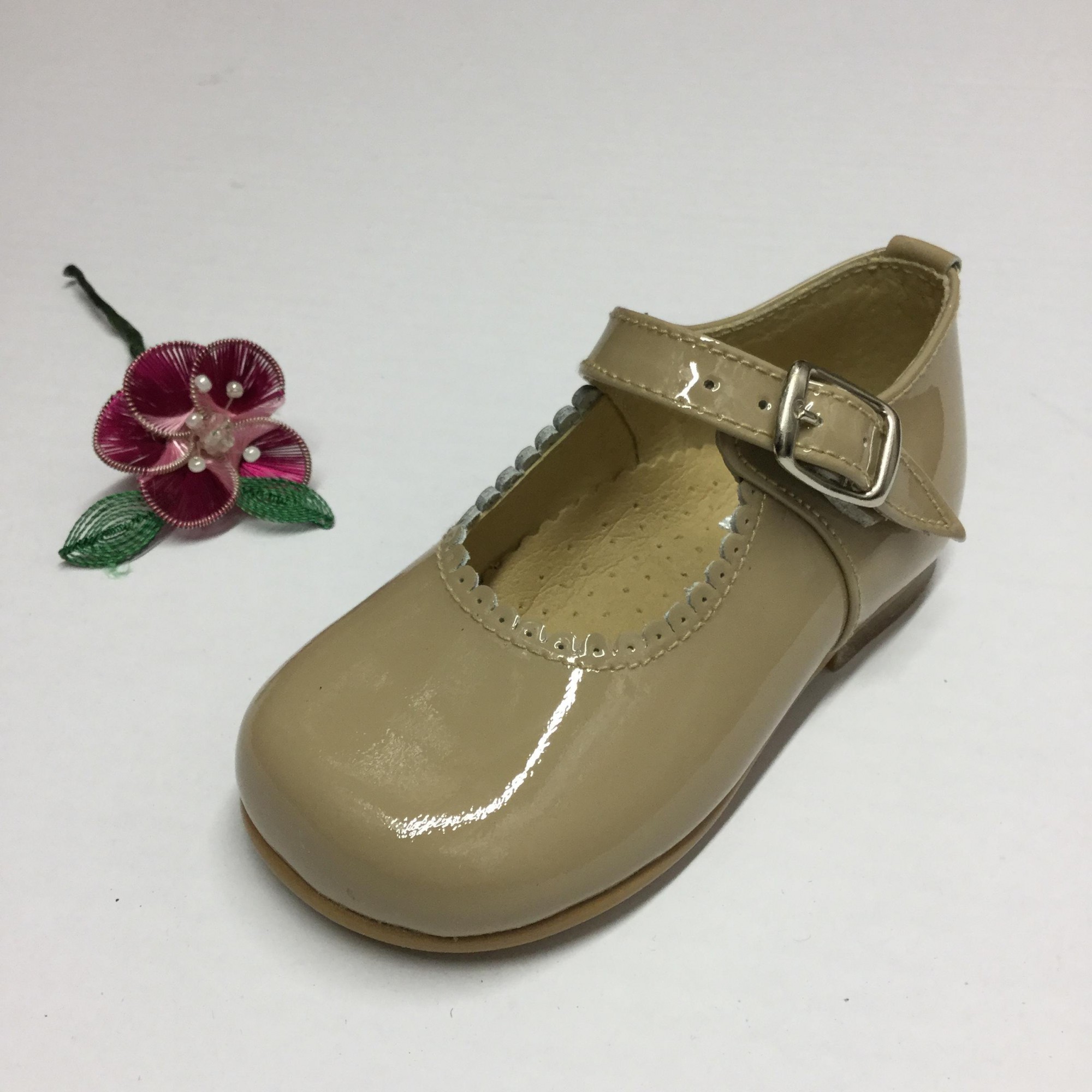 Mary Jane style patent leather shoes.