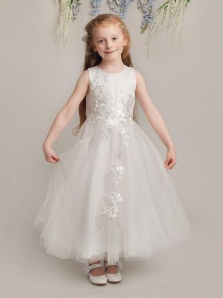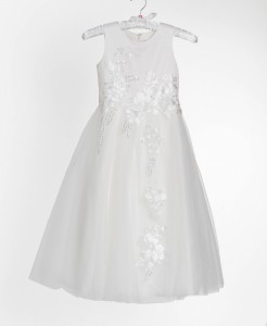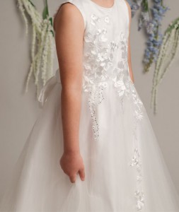 Sleeveless dress with floral appliqué and diamanté detail that cascades down the skirt.